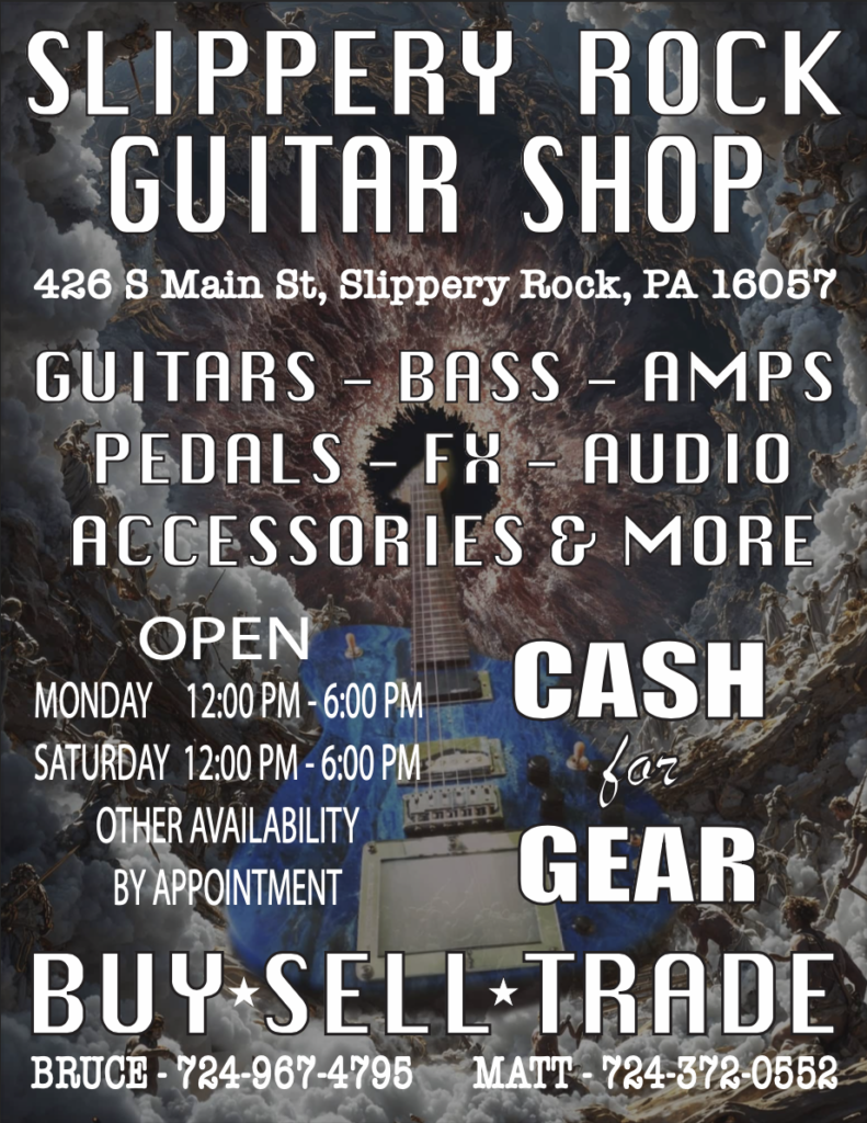 USED GUITARS, BASS, AMPS, PEDALS & MORE 426 South Main St, Slippery Rock, PA 16057 Monday and Saturday 12PM – 6PM VIEW CURRENT INVENTORY WESTERN PENNSYLVANIA GUITARSHOW